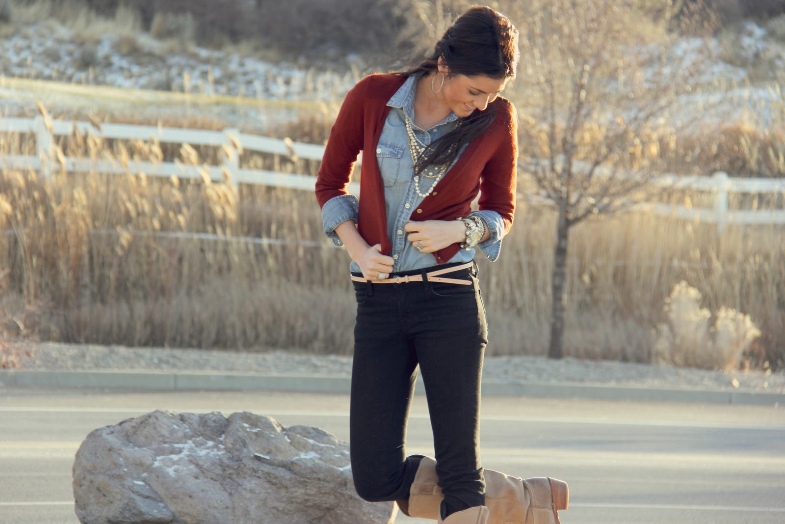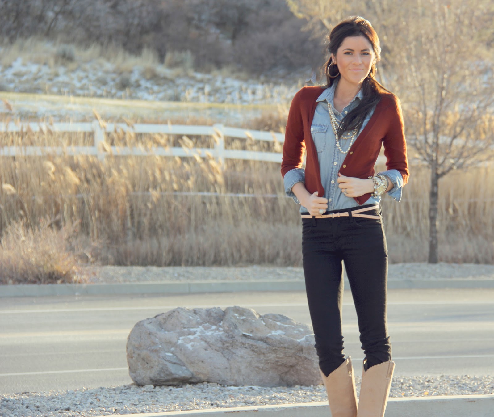 Sweater: J.Crew ON SALE!! color: hthr henna {last seen here} / Top: J.Crew {Similar style found here and here} / Belt: J.Crew Factory / Pants: Gap / Boots: Frye {last year} {Similar style found here} / Necklace: J.Crew {Similar style found here} |