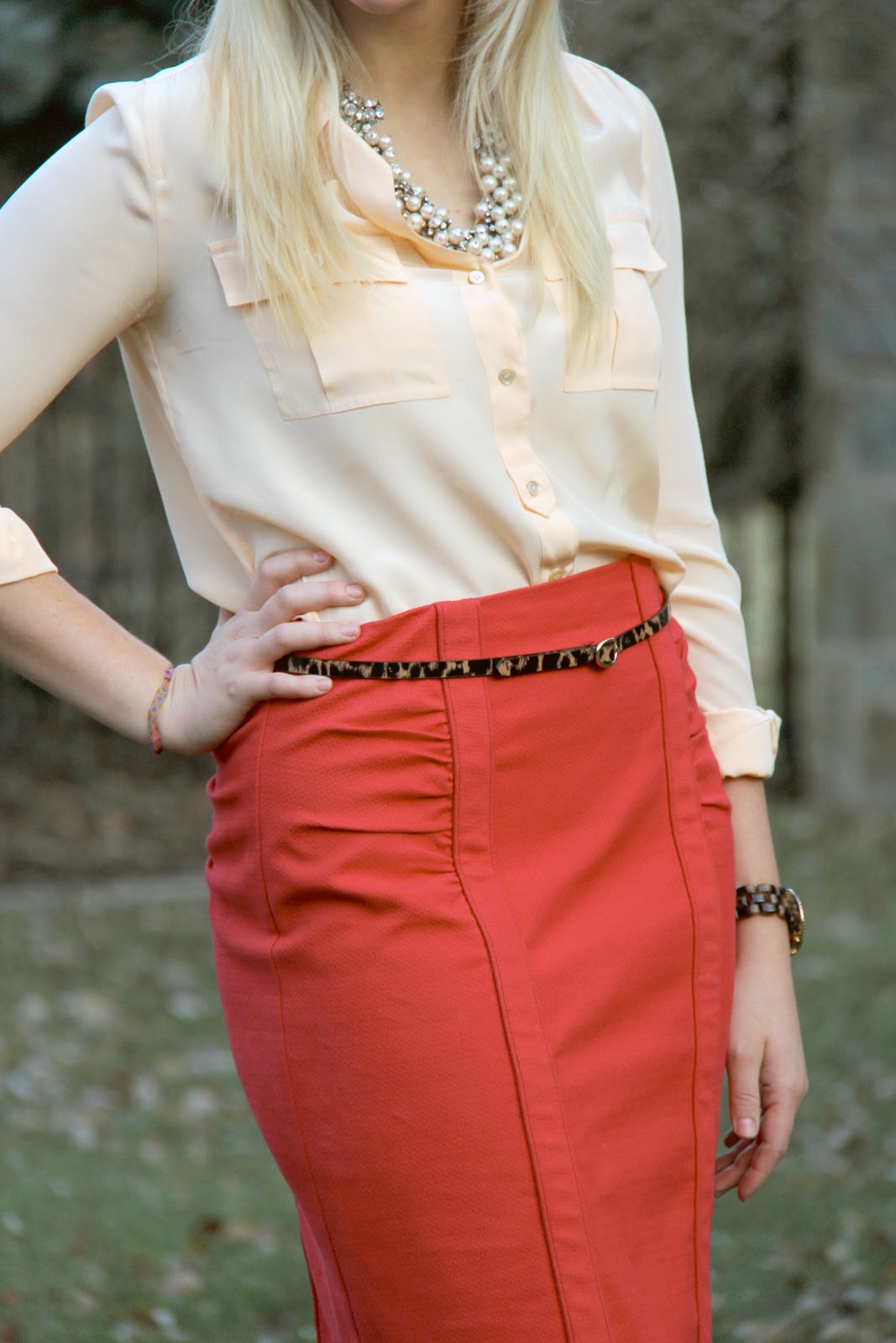 | Blouse: J.Crew {same blouse on sale! click here, similar style here}/ Belt: Bananna Republic {old} / Necklace: J.Crew {old} {similar style here and here}Skirt: Nanette Lapore {similar style here, here and here} / Shoes: Steve Maden / Watch: Michael Kors |