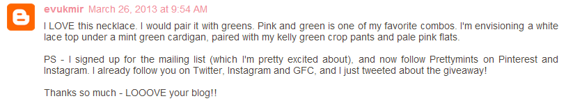 When choosing an item for a giveaway I always go with what catches my eye first. And for today's giveaway, this fabulous Prettymints Ombre Link Necklace was my personal top pick! I love the ombre effect, the color (pink is my favorite, obviously), and the way it can make a statement while still adding that delicate touch. Today I'm excited for FIVE Pink Peonies readers to win this fabulous Prettymints piece! MUST BE A FOLLOWER OF PINK PEONIES TO ENTER (via Google Friend Connect on right sidebar) Winners | Congrats Sarah Morris, MonicaPaige, Natalie Johnson, Evukmir, & Chelsea! Email me at | thepinkpeonies@yahoo dot com | A special thanks to all who entered! |